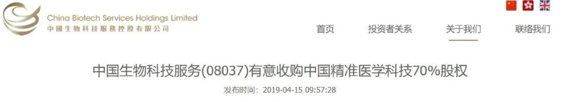 中国生物科技服务控股有限公司(08037.HK)2019年4月15日发布公告,有意收购中国精准医学科技的70%股权,代价将按发行价2.00港元发行4095万新股的方式支付。